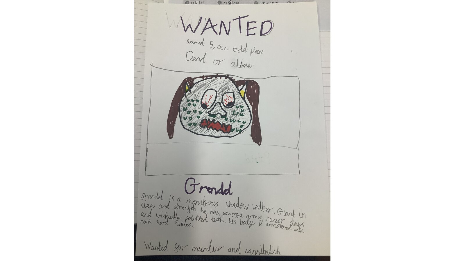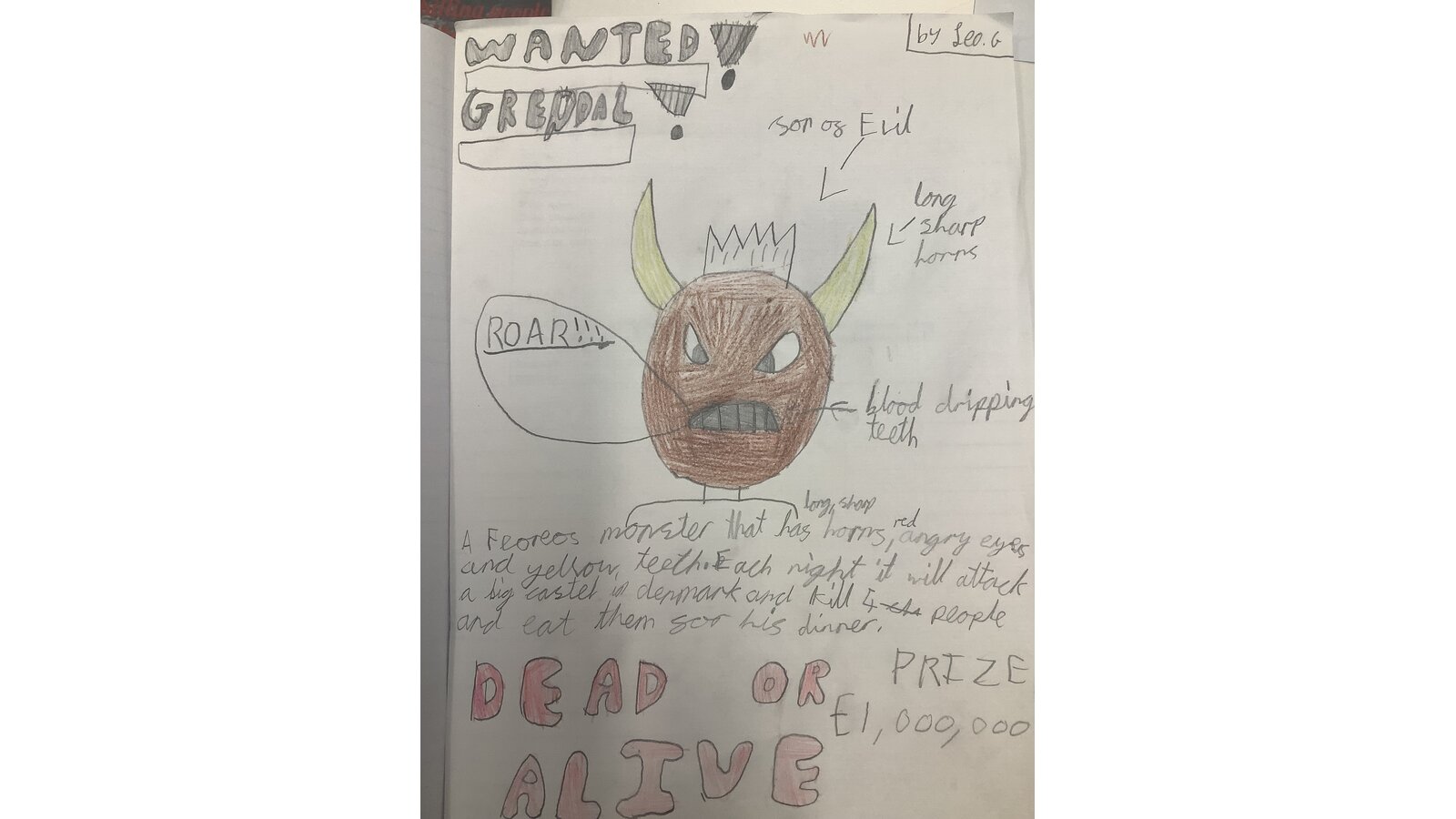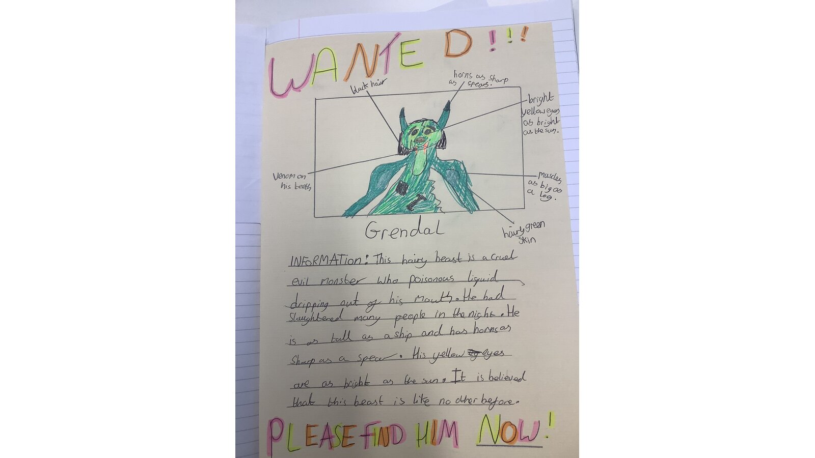 7 May 2024 dbuckley Class Three Previous Next Our class have been reading the Beowulf saga and have created ‘Wanted’ posters for Grendel.