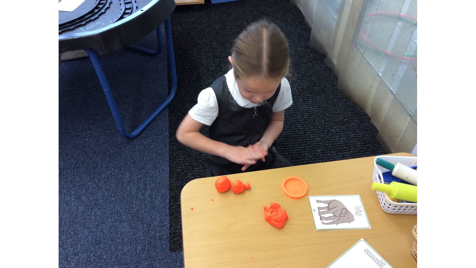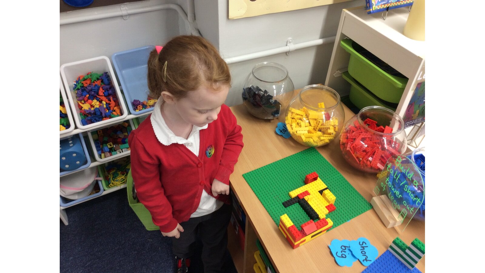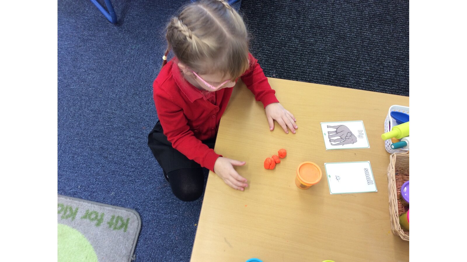 In Maths, children in EYFS have been exploring measure and pattern. On Monday we looked at using the vocabulary big, little, large and small and had a teddy bears picnic to compare what size food the little and big bears would need. Today we used the language short and long to compare length and tall and short to compare height. In continuous provision the children applied their learning by making short and long trains in the construction area; tall and short towers and big and small houses in the Lego area. They also made big and small balls of dough at the play-dough station and sorted animals into big and small groups.
