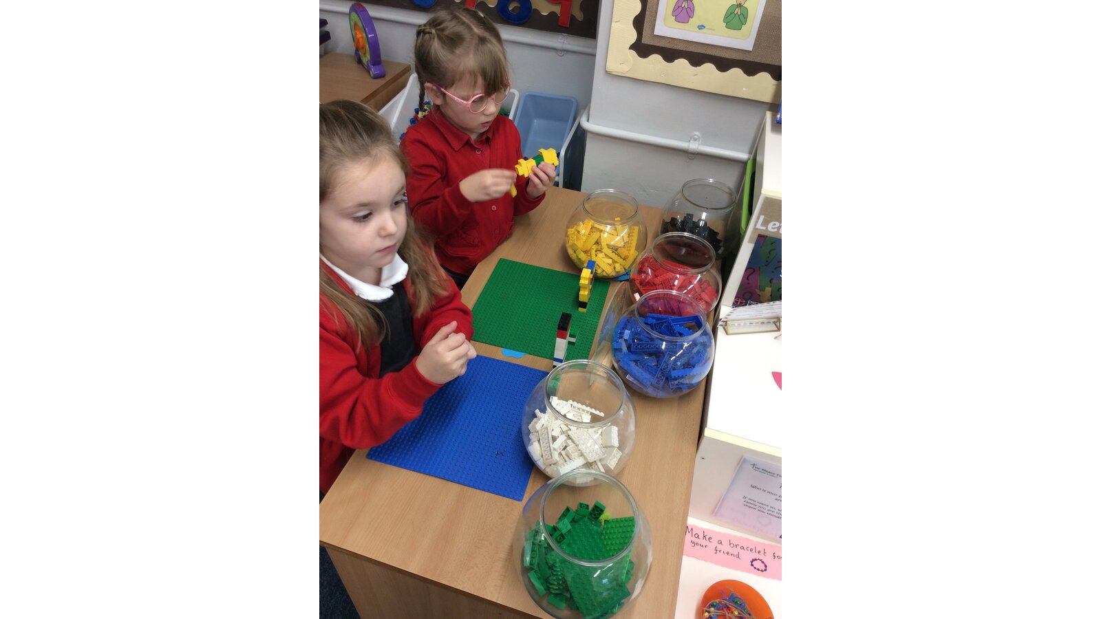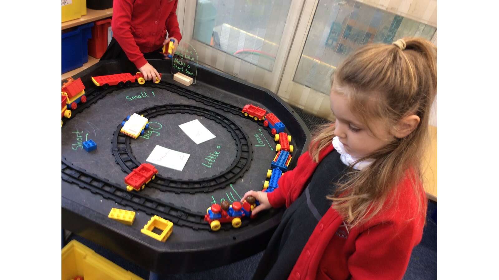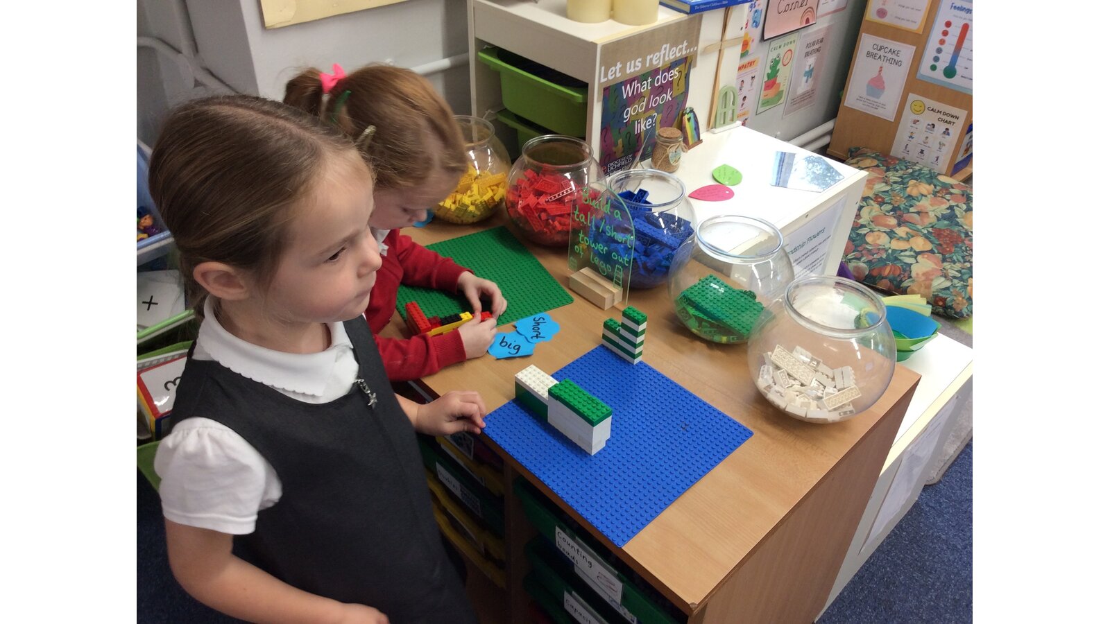 In Maths, children in EYFS have been exploring measure and pattern. On Monday we looked at using the vocabulary big, little, large and small and had a teddy bears picnic to compare what size food the little and big bears would need. Today we used the language short and long to compare length and tall and short to compare height. In continuous provision the children applied their learning by making short and long trains in the construction area; tall and short towers and big and small houses in the Lego area. They also made big and small balls of dough at the play-dough station and sorted animals into big and small groups.
