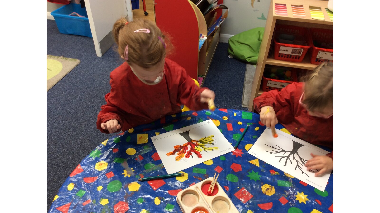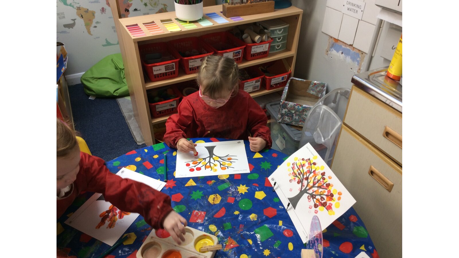 They also created beautiful autumn trees using pom-poms and pegs to stamp vibrant red, orange, yellow and brown leaves onto tree outlines. The children loved experimenting with the different colours, seeing how they could layer them to mimic the changing autumn leaves.