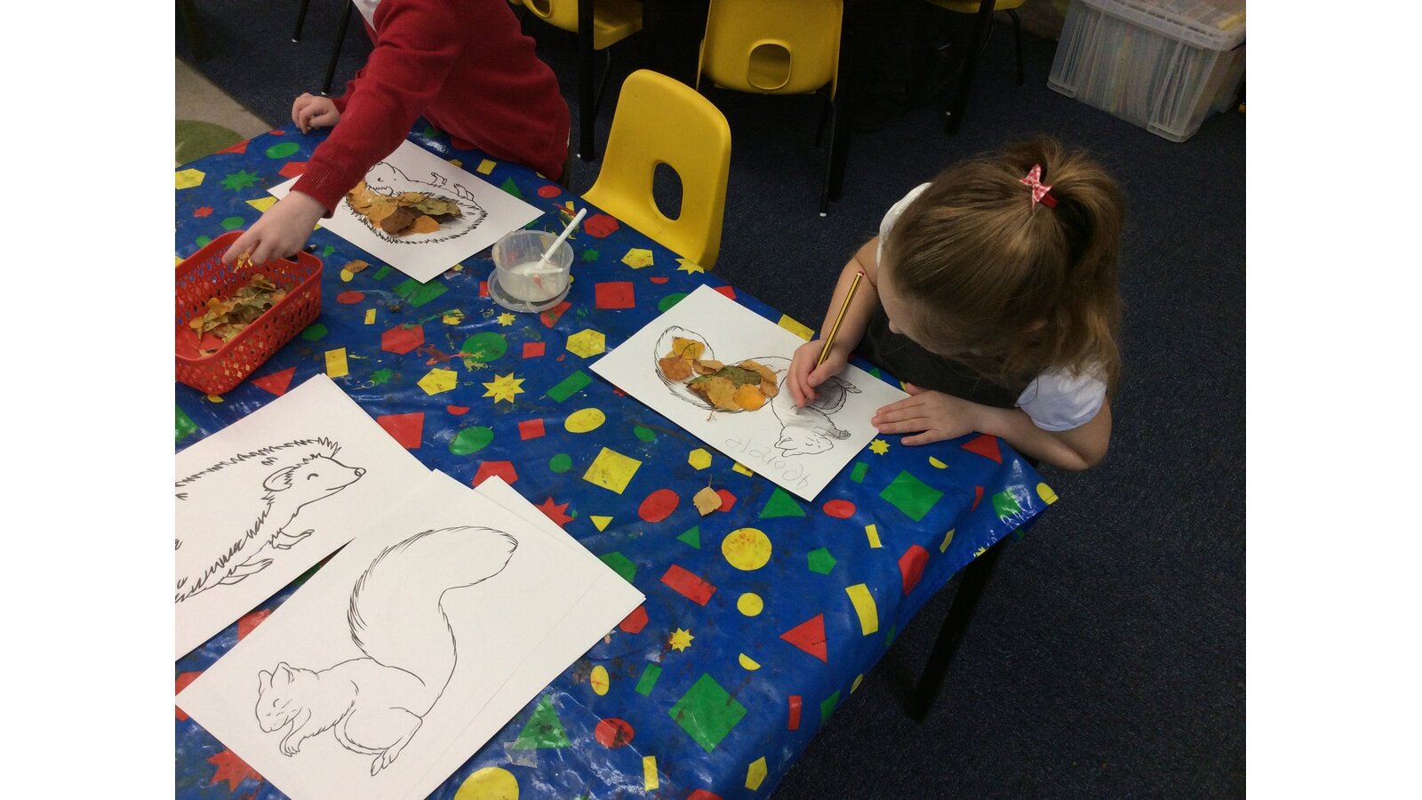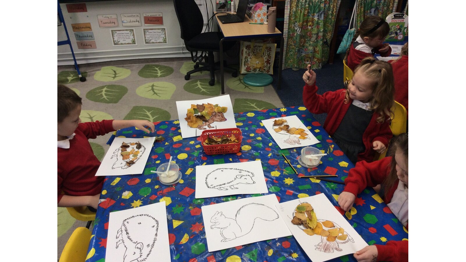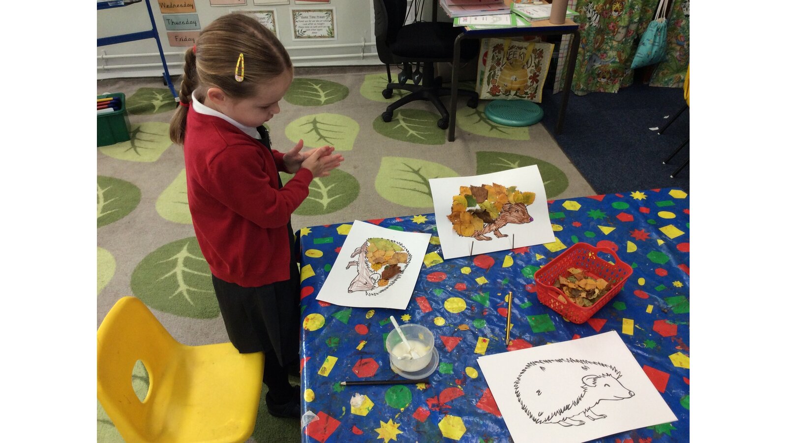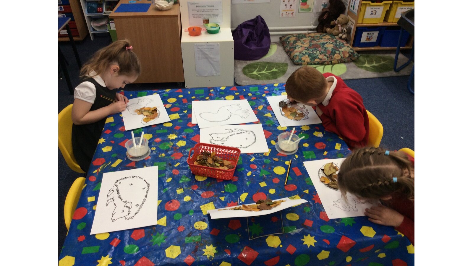 The children made hedgehogs and squirrels out of leaves they collected outside. Carefully choosing leaves of different shapes and sizes, they arranged them to create their very own woodland animals. There were spiky hedgehogs and bushy-tailed squirrels all around, reminding us of the animals we might spot as the weather turns colder.