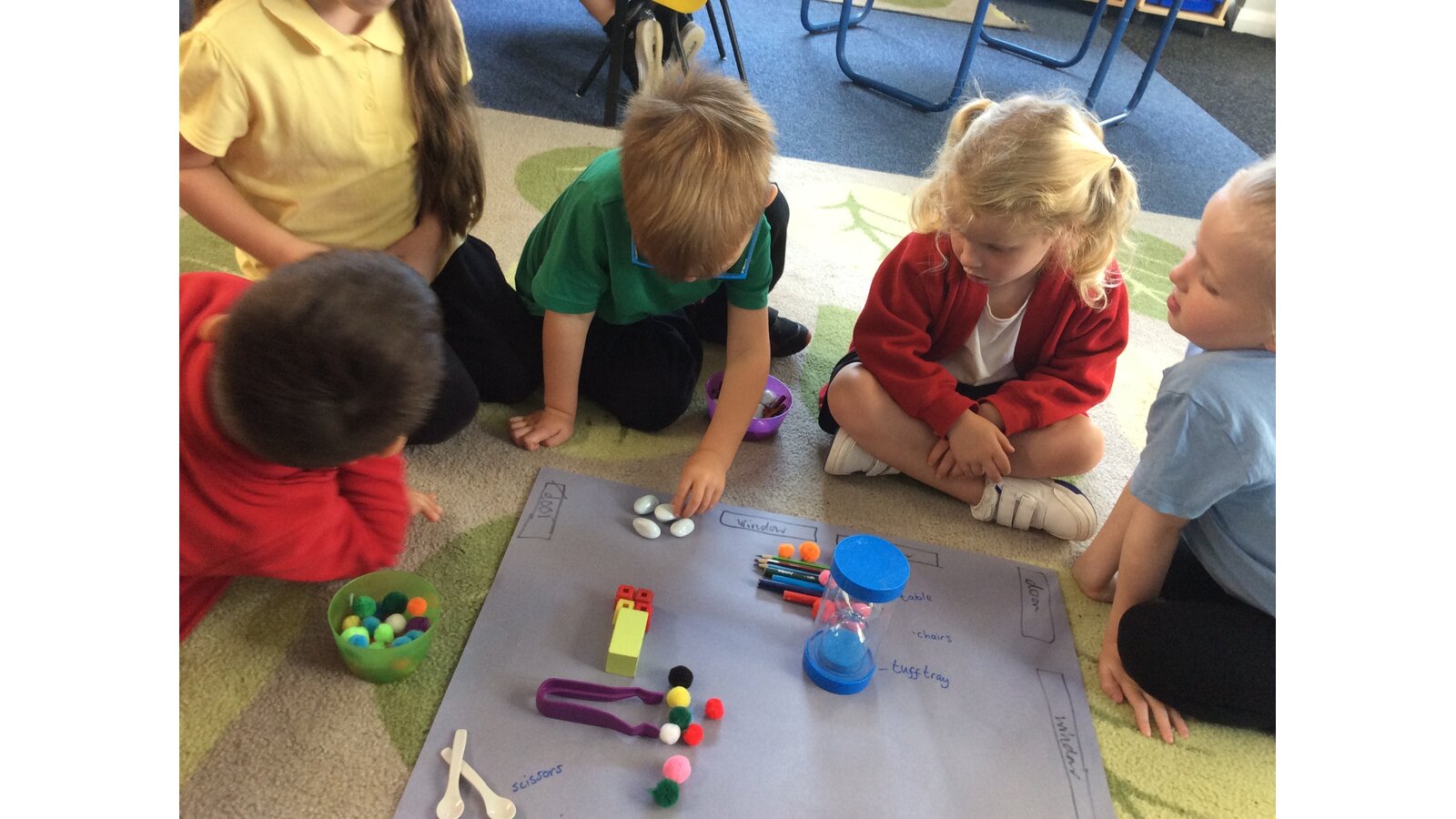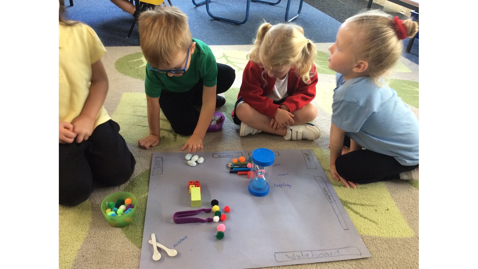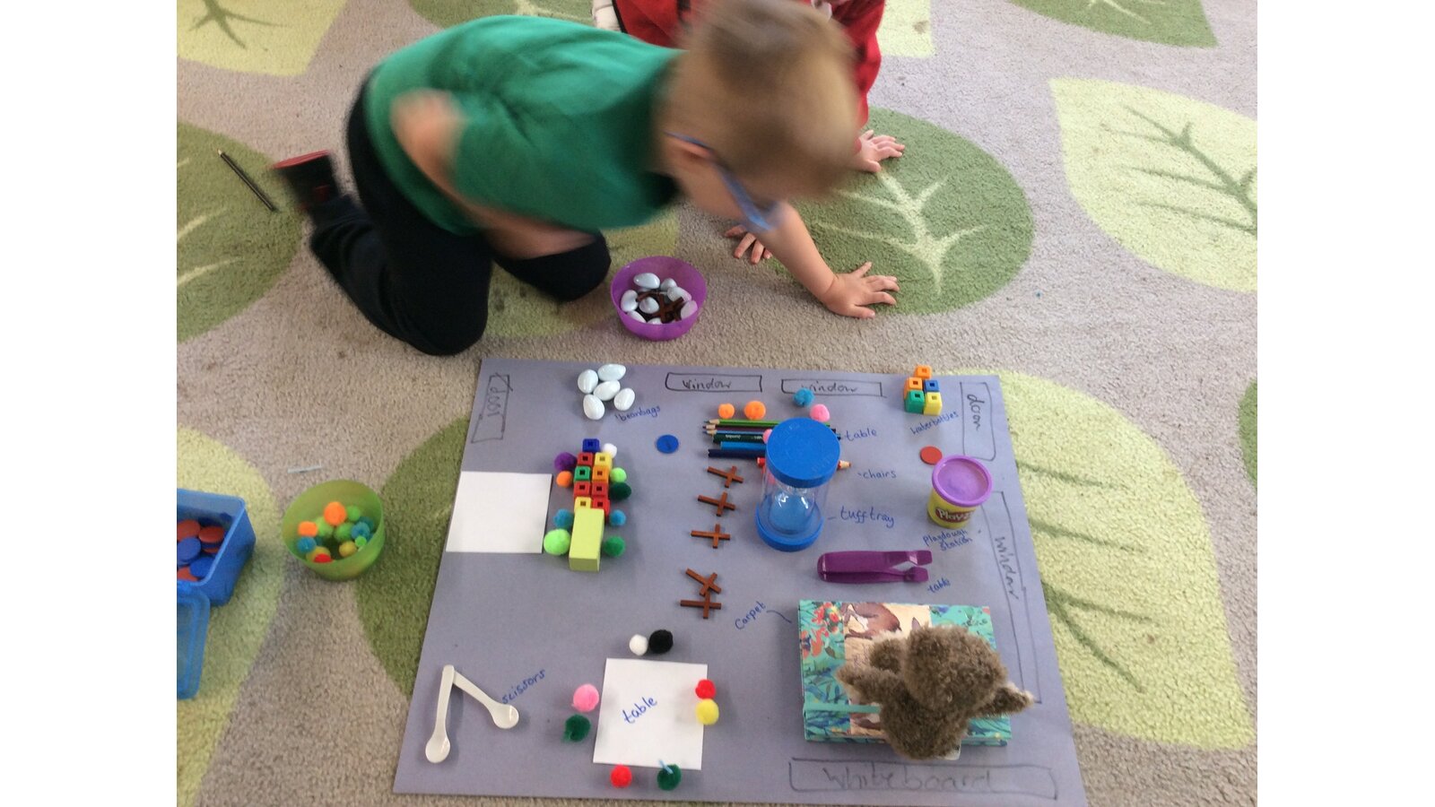 Reception children used real classroom objects to build "messy maps", thinking carefully about where things should go. They worked together to plan the layout and explain their choices.