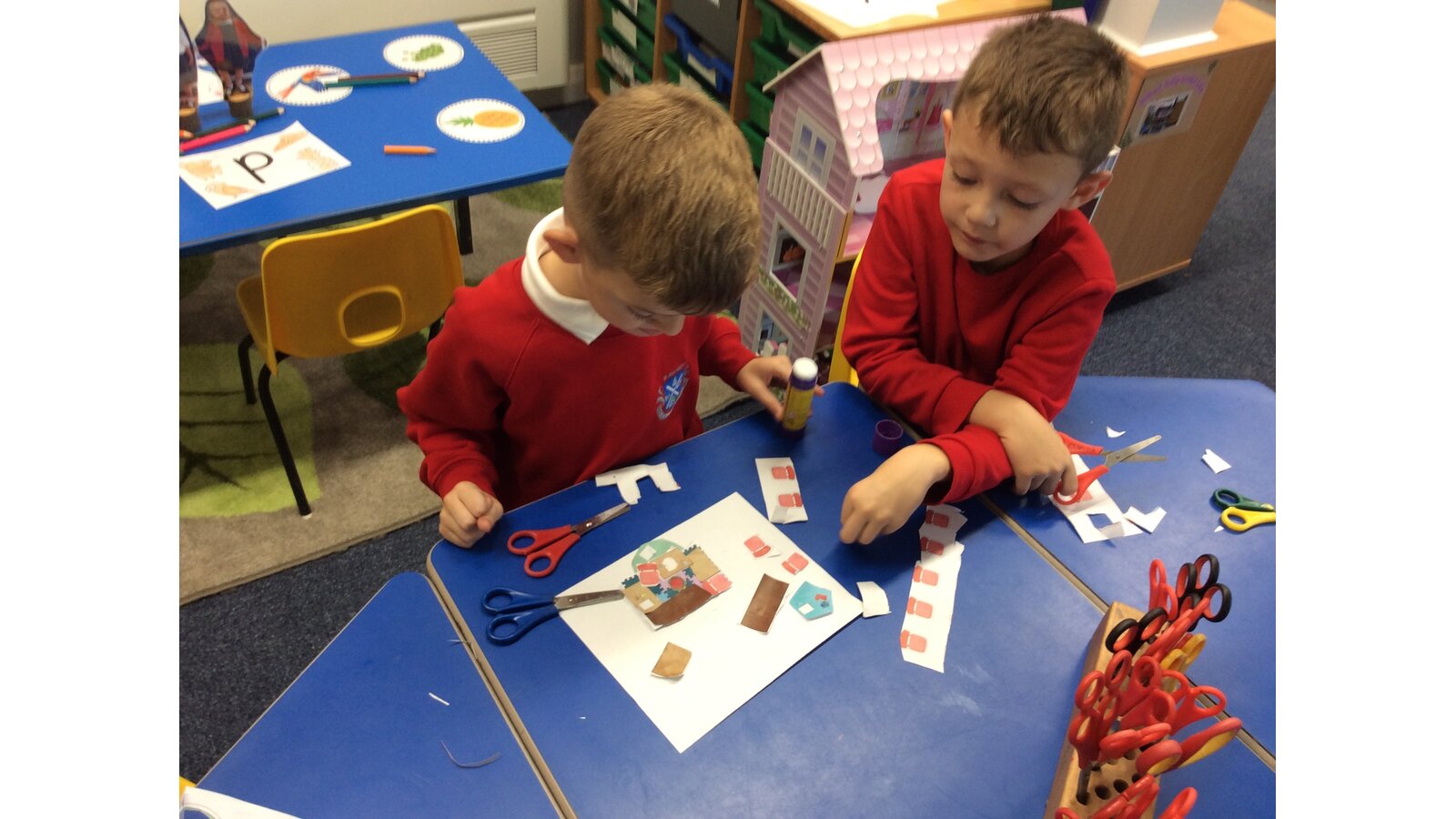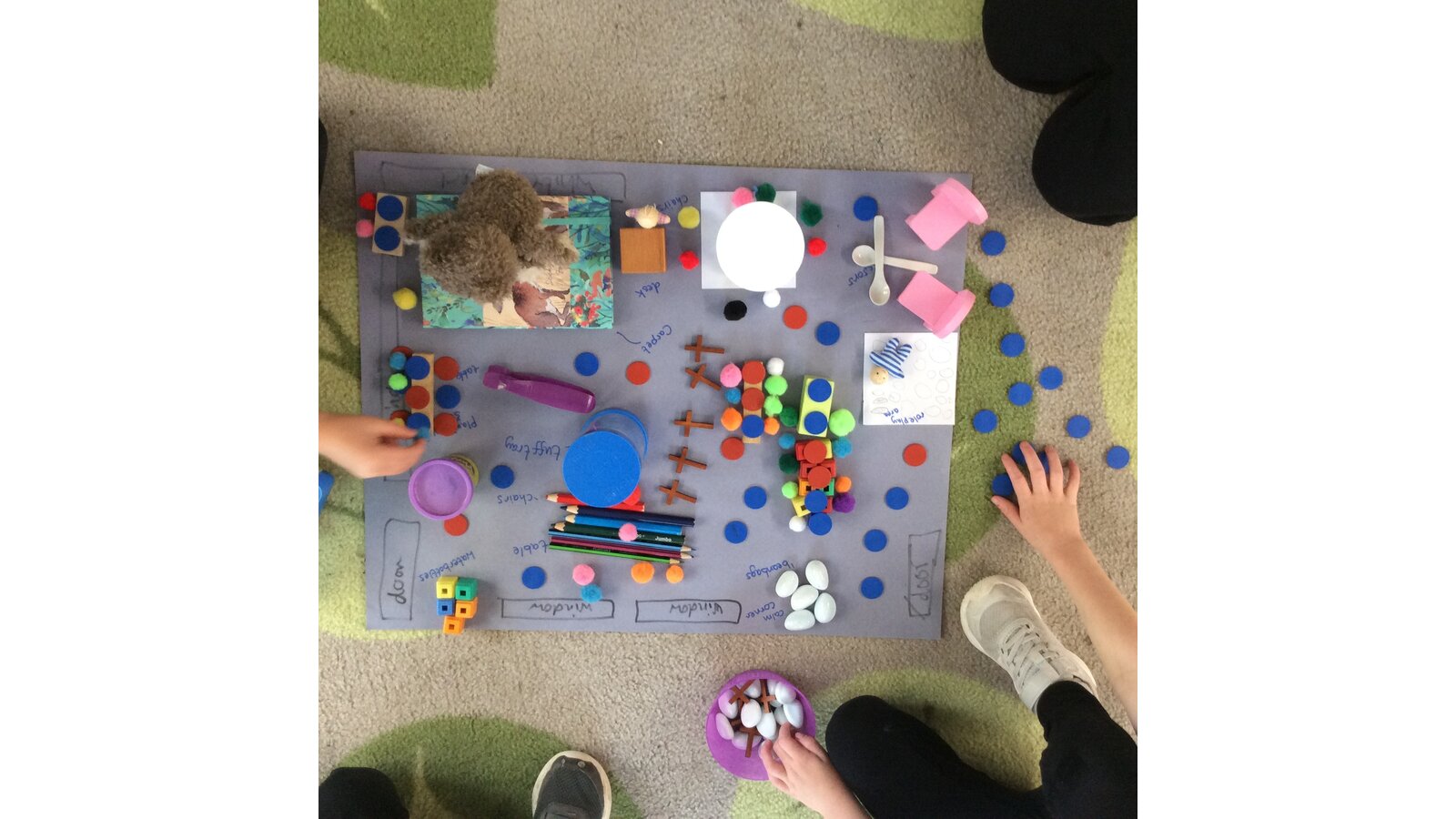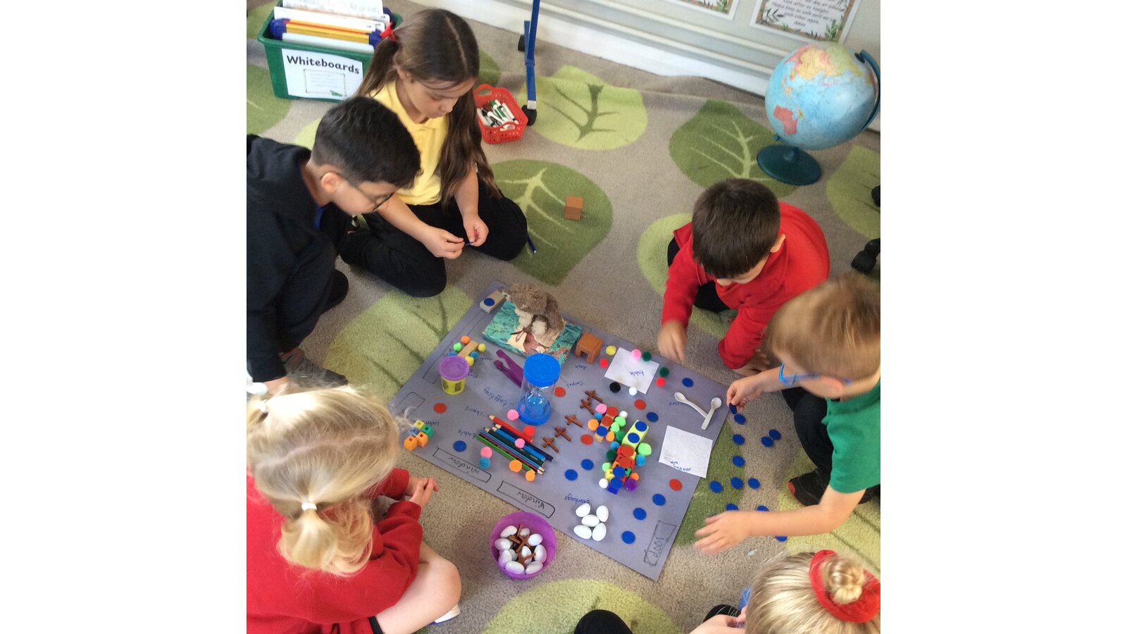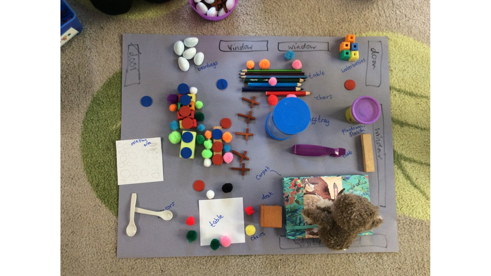 Reception children used real classroom objects to build "messy maps", thinking carefully about where things should go. They worked together to plan the layout and explain their choices.