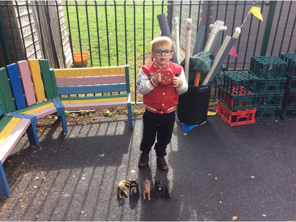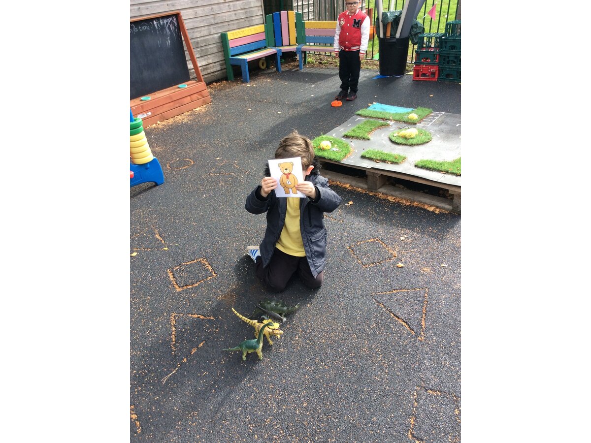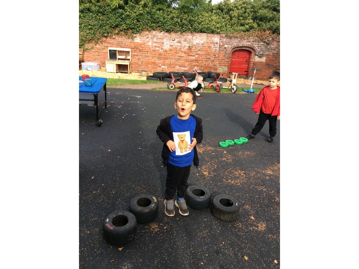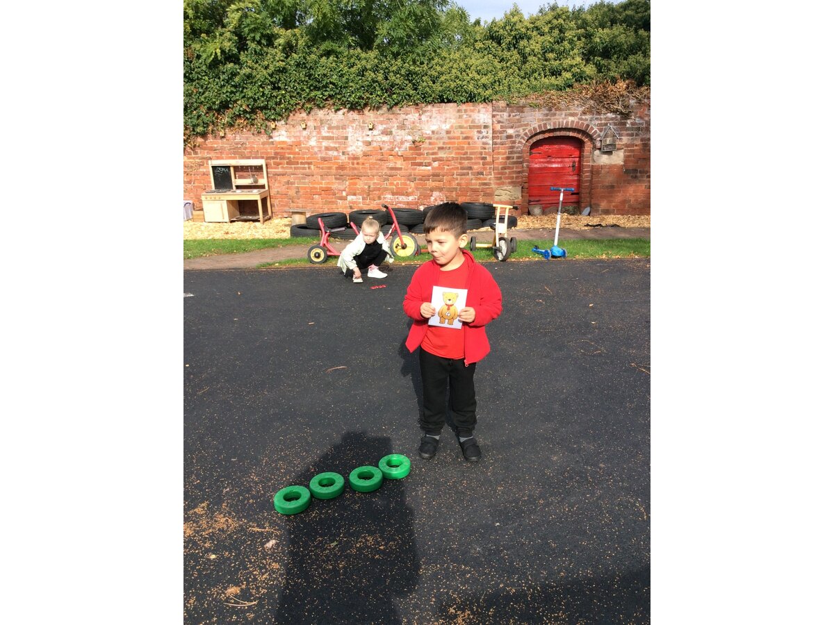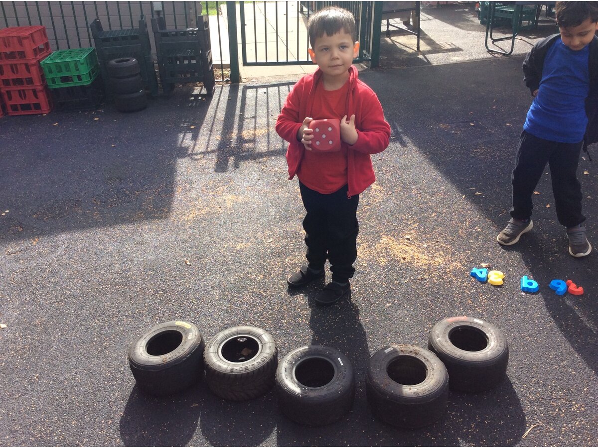 They worked brilliantly together to make groups of 4 and 5 using tyres, dinosaurs, polos, sticks and other loose parts they discovered in our outdoor area. Once they’d made their groups, the children matched them to the correct numerals and proudly showed their work to their friends.