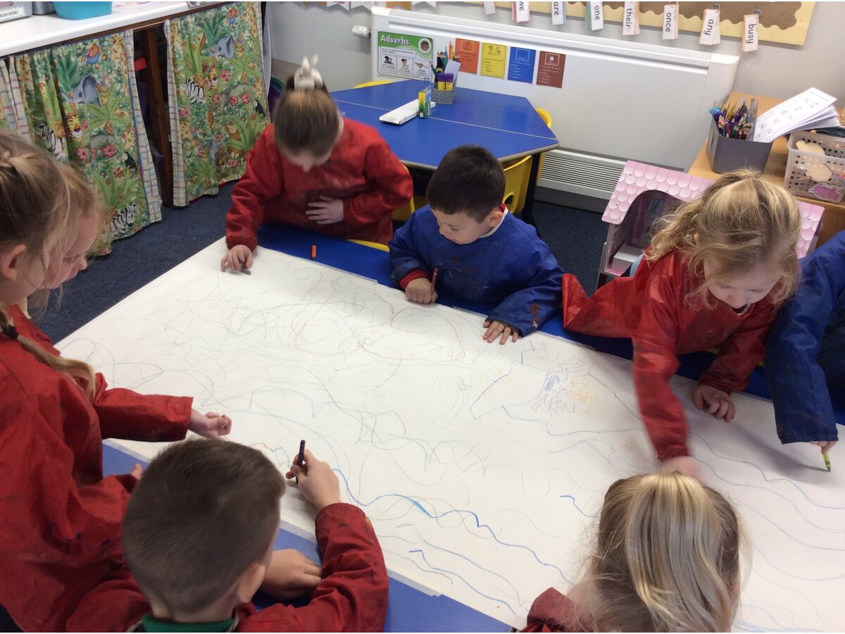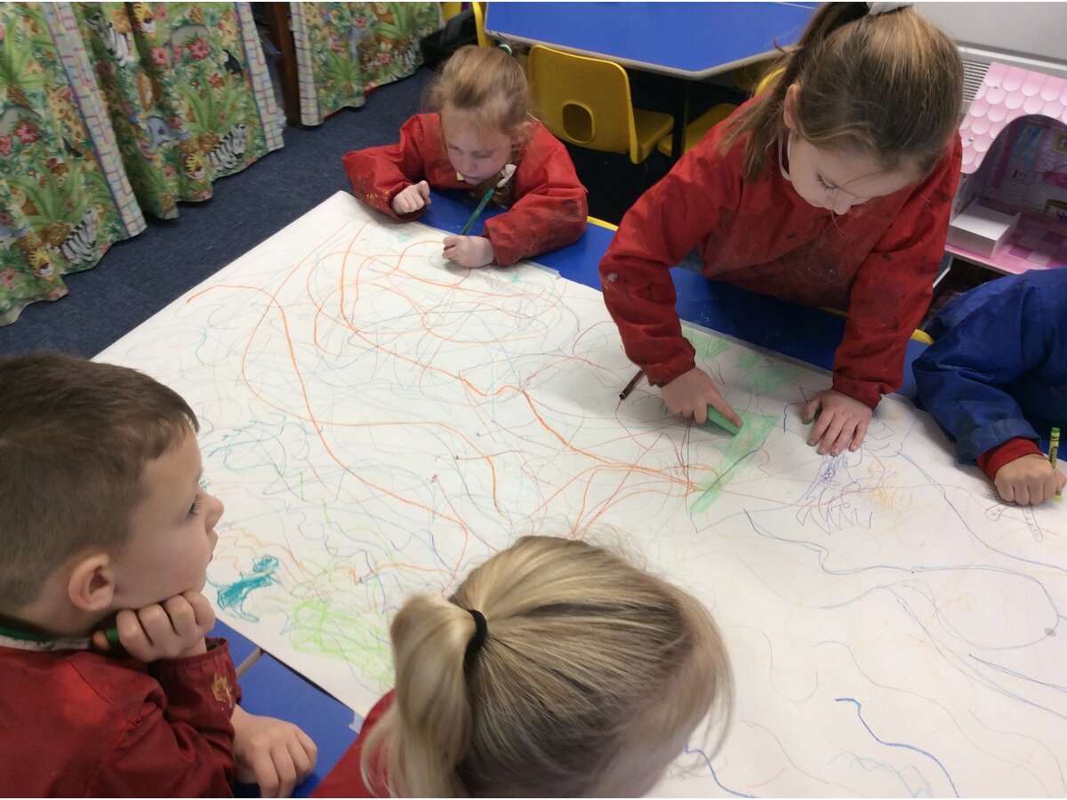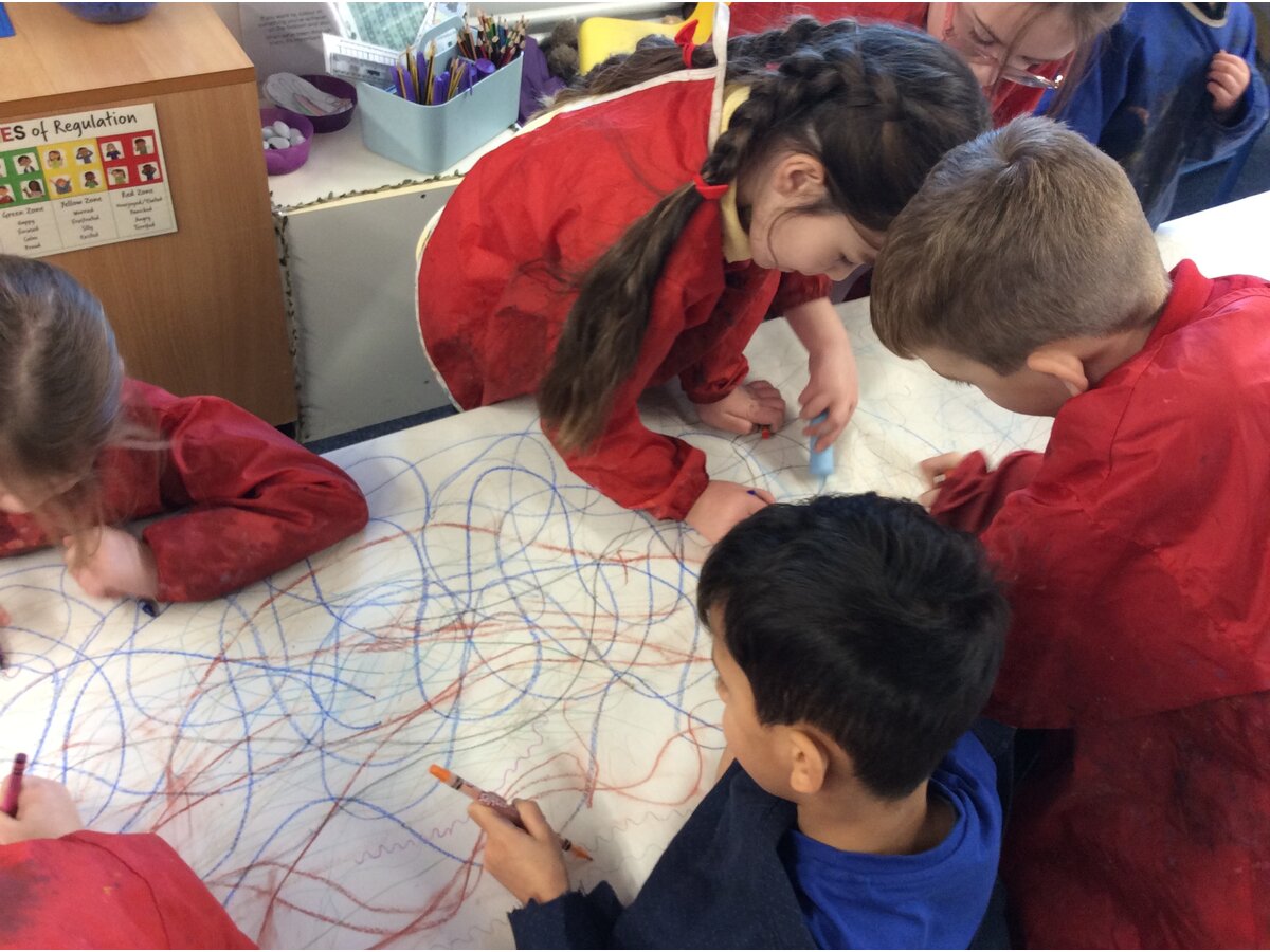 But the creativity didn't stop there! After our individual explorations, we worked together to create a magnificent GIANT piece of shared artwork! We listened to a piece of music that made us all think of the deep, mysterious ocean. As the music played, we used big, sweeping swirls and wavy lines to create an incredible underwater world.