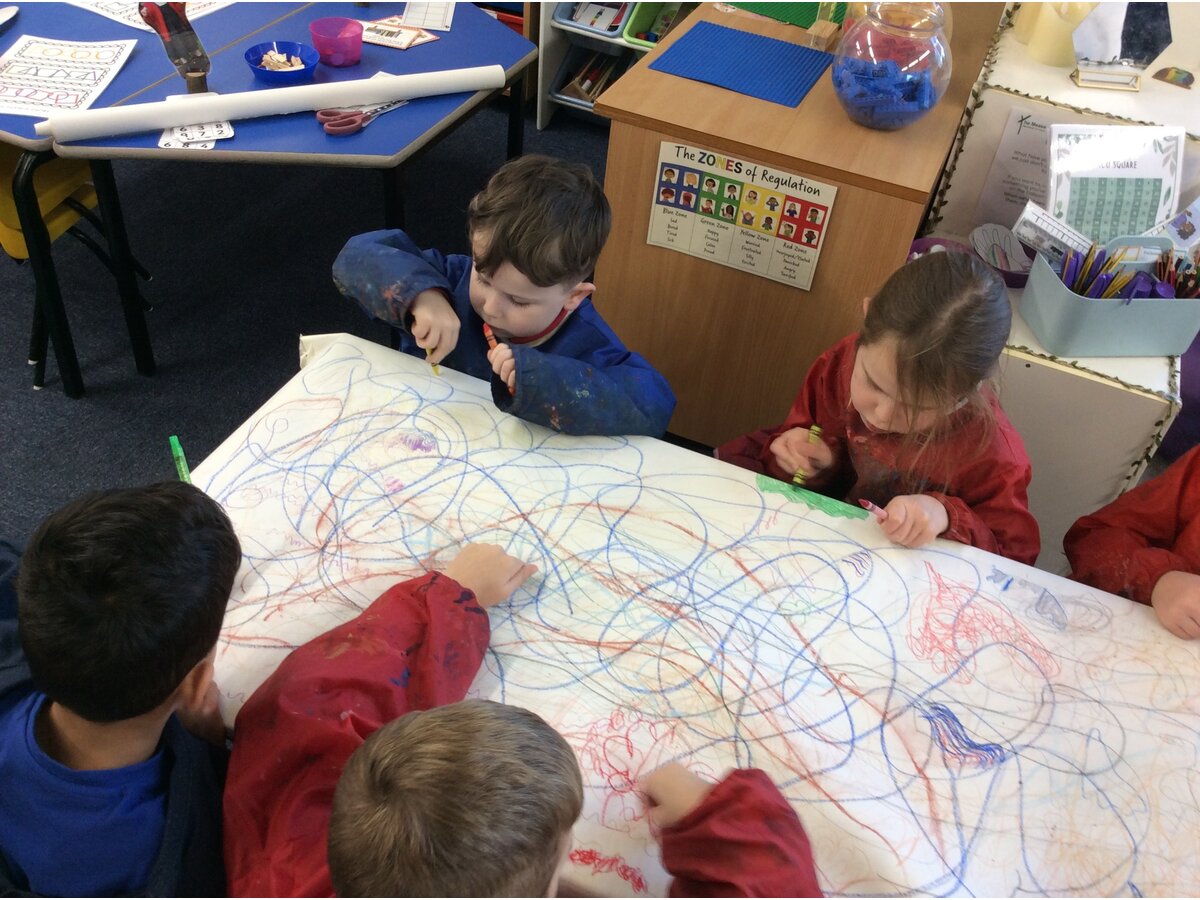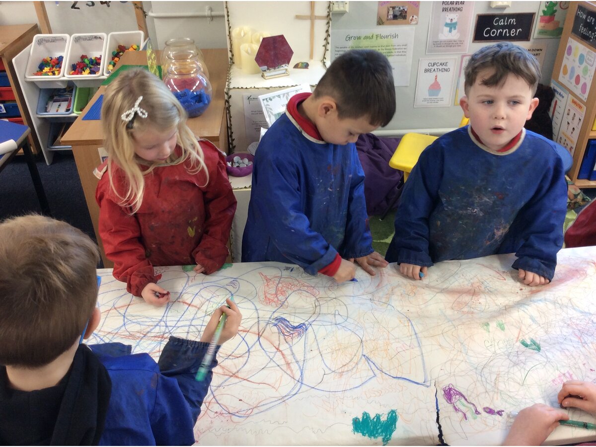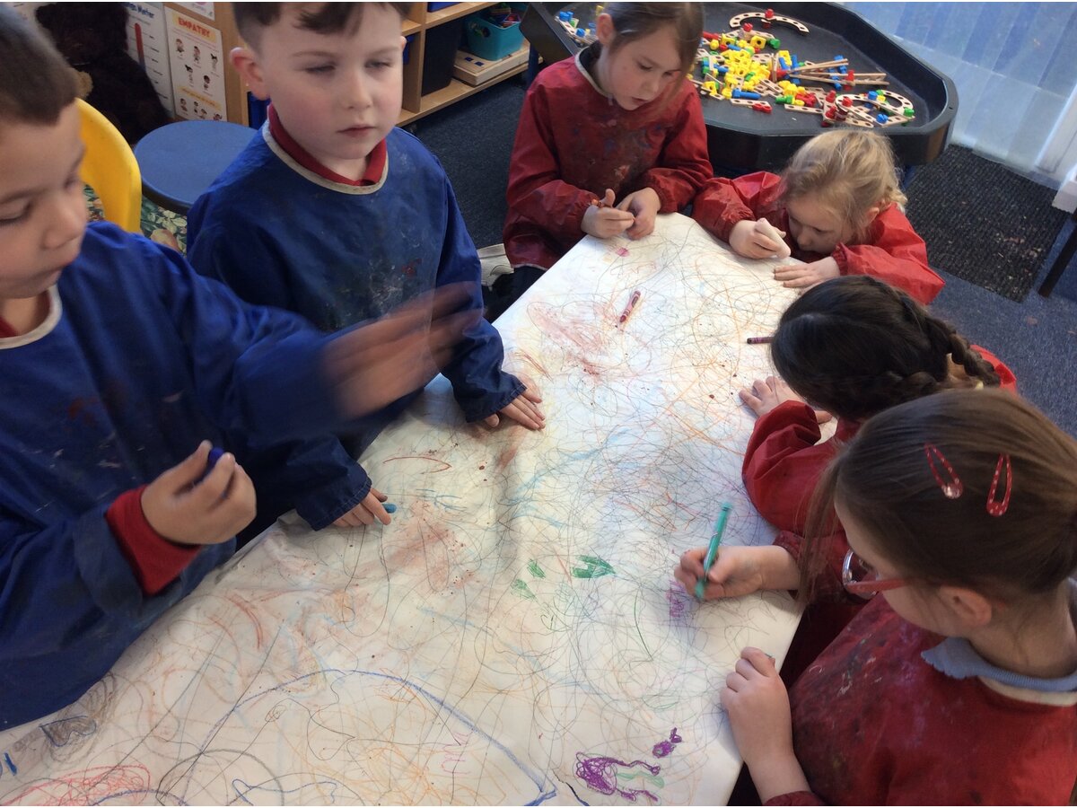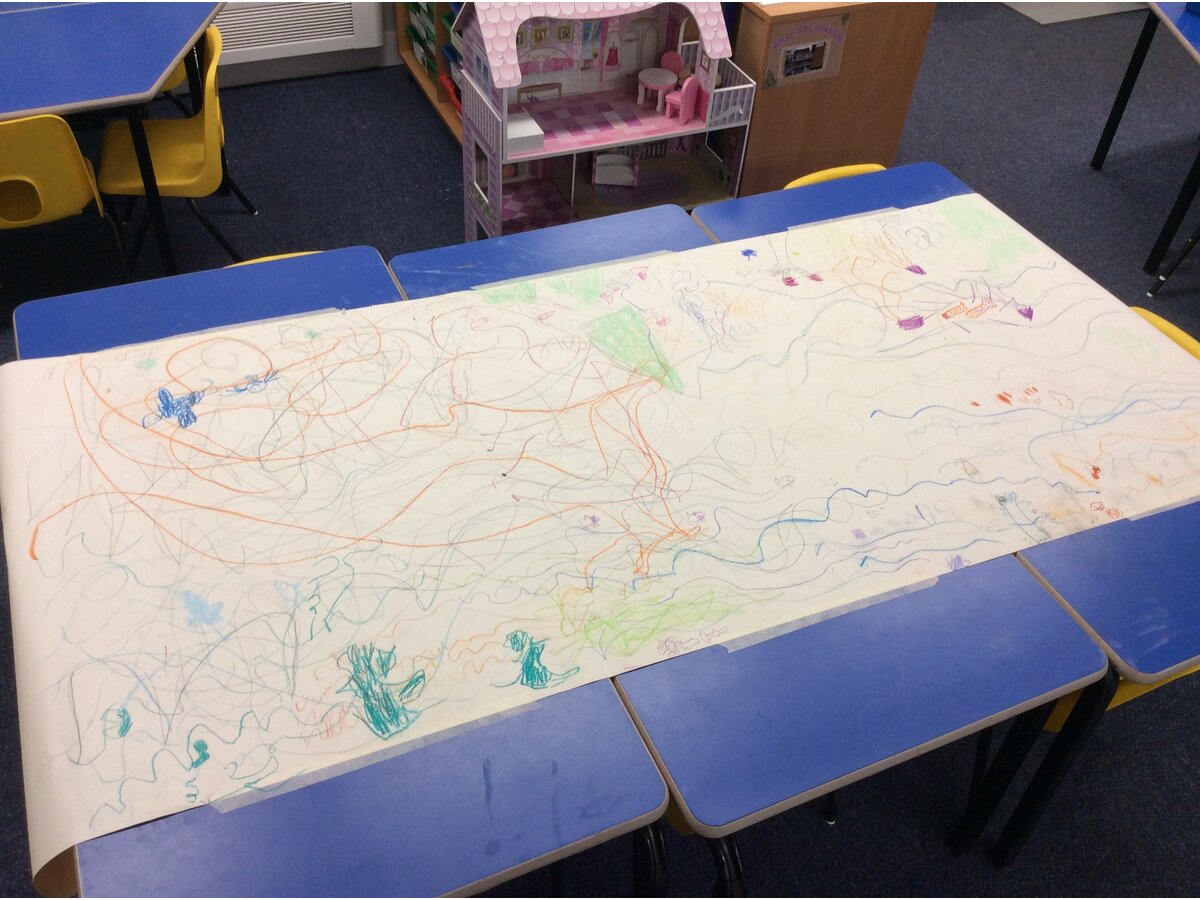 But the creativity didn't stop there! After our individual explorations, we worked together to create a magnificent GIANT piece of shared artwork! We listened to a piece of music that made us all think of the deep, mysterious ocean. As the music played, we used big, sweeping swirls and wavy lines to create an incredible underwater world.