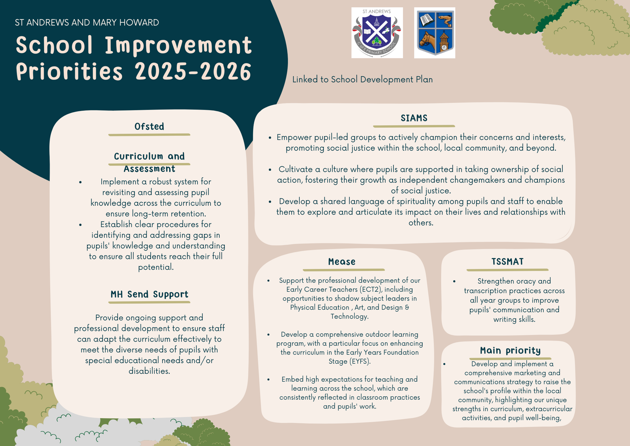 At St Andrews CofE Primary School, we are committed to fostering an environment where every child can "Grow and Flourish." Our School Improvement Plan is designed to enhance the quality of teaching and learning, promote effective leadership, and ensure that all members of our school community are valued and supported.