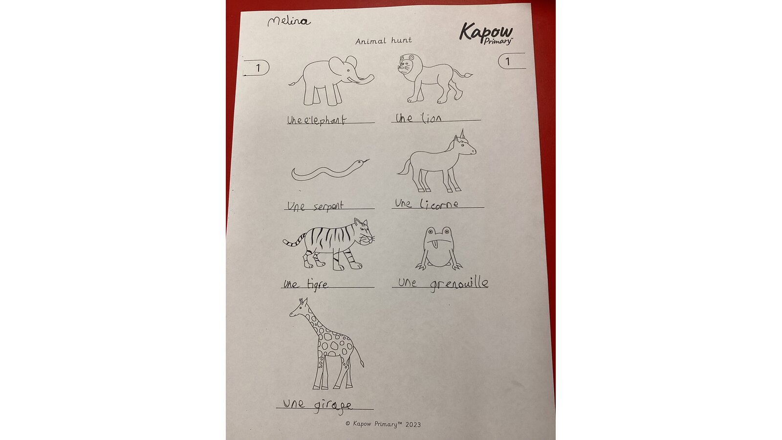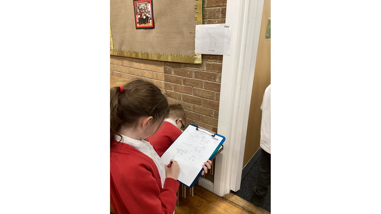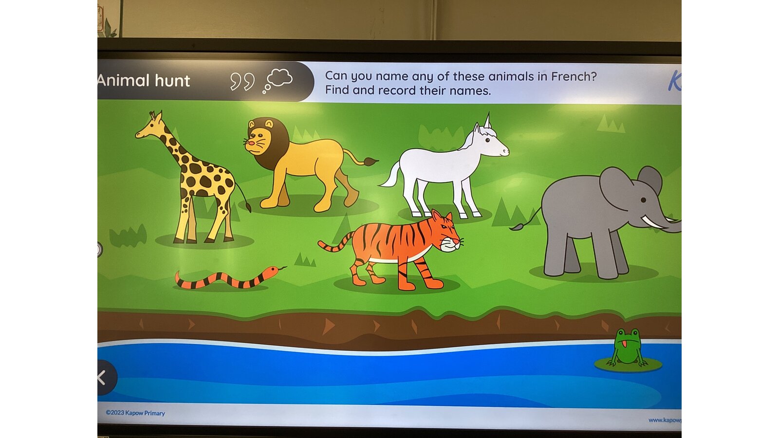 In our French lesson today we went on an animal hunt to find and copy the names of the animals in French. Back in our classroom we practised saying the names with our partners.