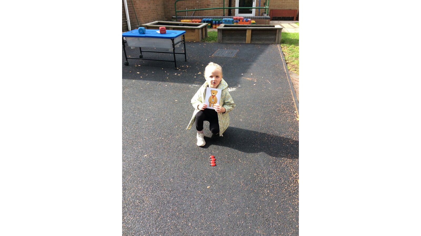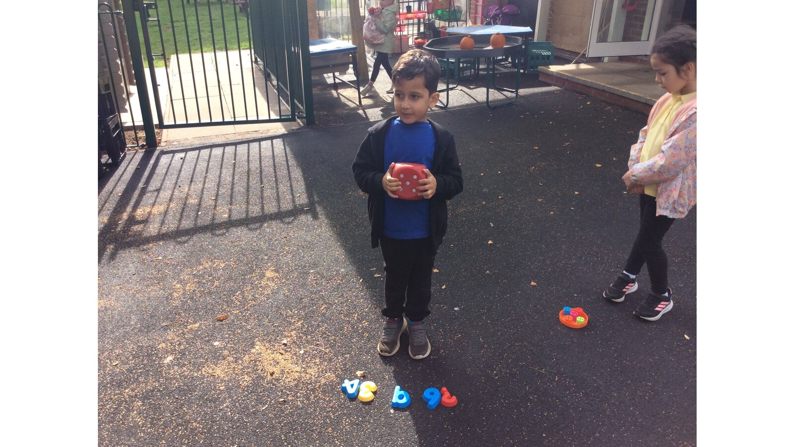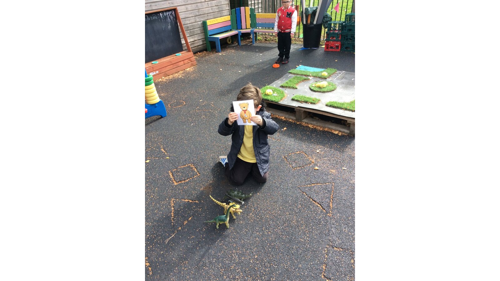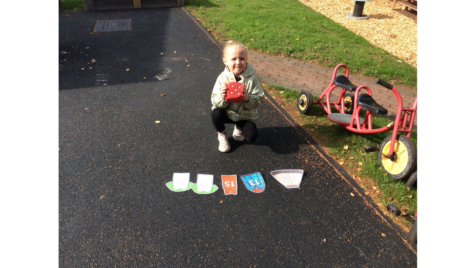 They worked brilliantly together to make groups of 4 and 5 using tyres, dinosaurs, polos, sticks and other loose parts they discovered in our outdoor area. Once they’d made their groups, the children matched them to the correct numerals and proudly showed their work to their friends.