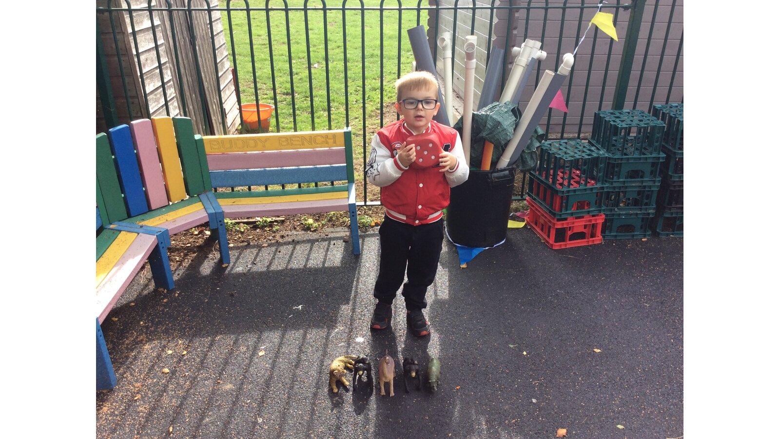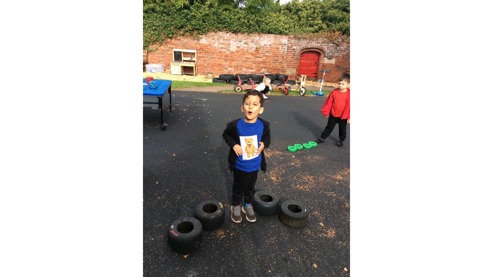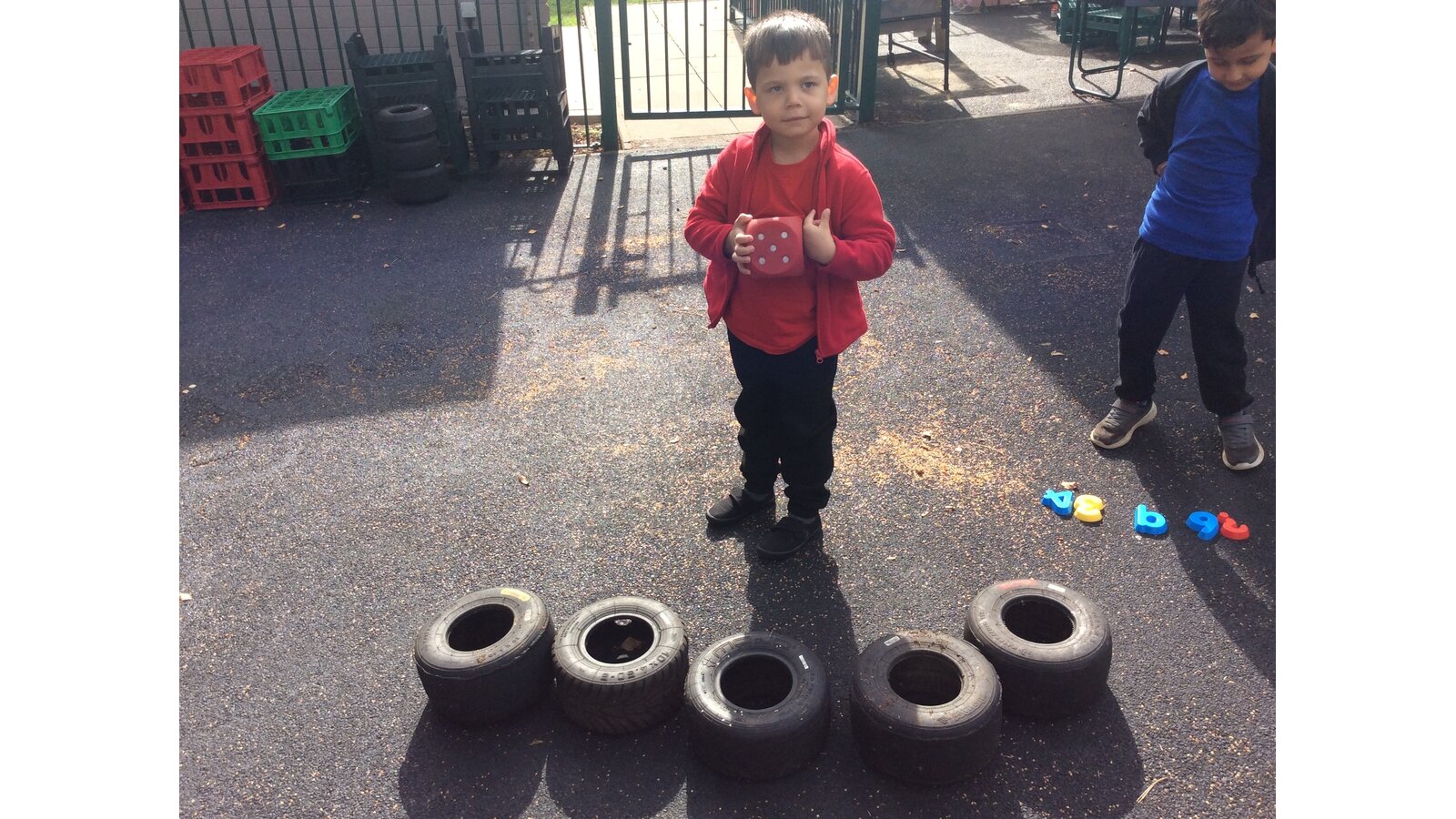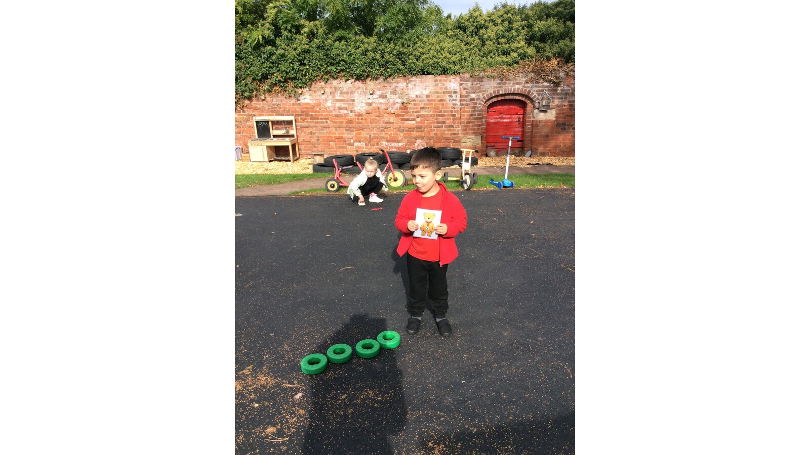 They worked brilliantly together to make groups of 4 and 5 using tyres, dinosaurs, polos, sticks and other loose parts they discovered in our outdoor area. Once they’d made their groups, the children matched them to the correct numerals and proudly showed their work to their friends.
