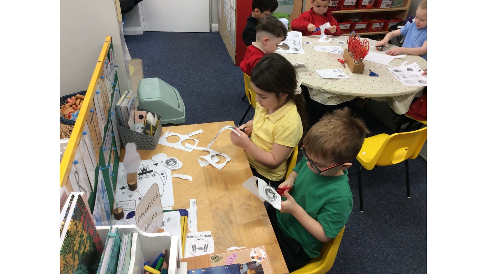 By cutting along these specific lines, the children are working on bilateral coordination (using both hands together—one to turn the paper and one to snip) and visual tracking, which is essential for reading and writing.